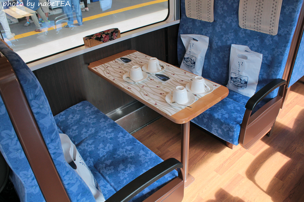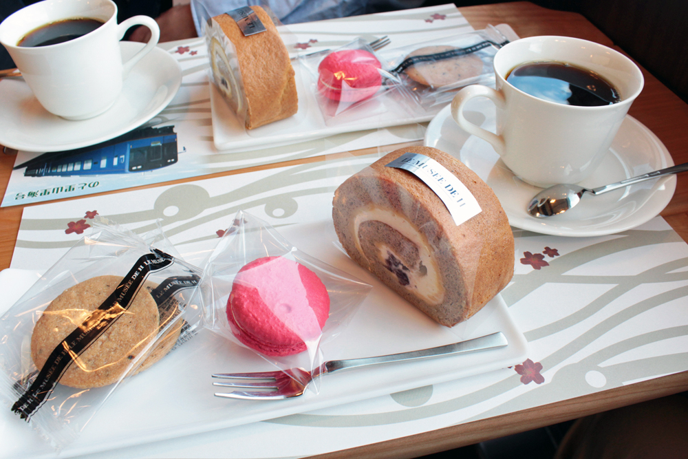 さて、「スイーツプラン」と銘打ってあるだけあり乗車後すぐにコーヒーのサービスが、発車後早々にケーキと菓子が載ったプレートが運ばれてきます。