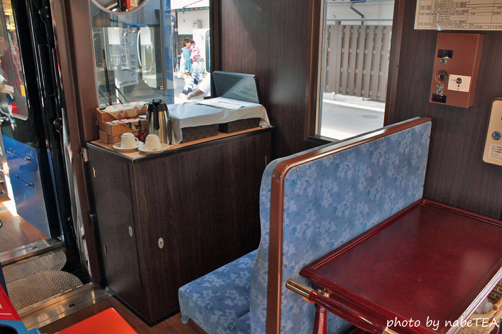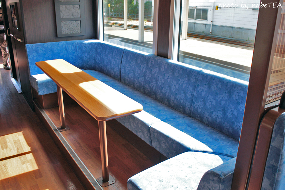 ボックス席の座席間隔やトイレの配置等は一般車と変わりませんが、ソファー席(里海号)や海側を向いた2人席(両車とも)、サービスカウンター(里山号)などが設けられているのが特徴的です。