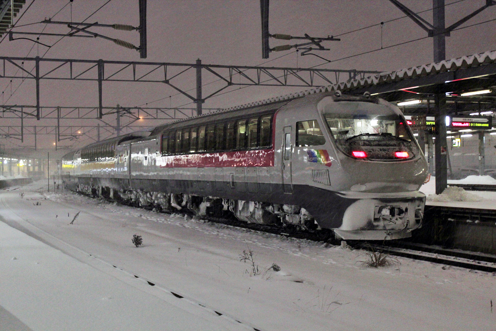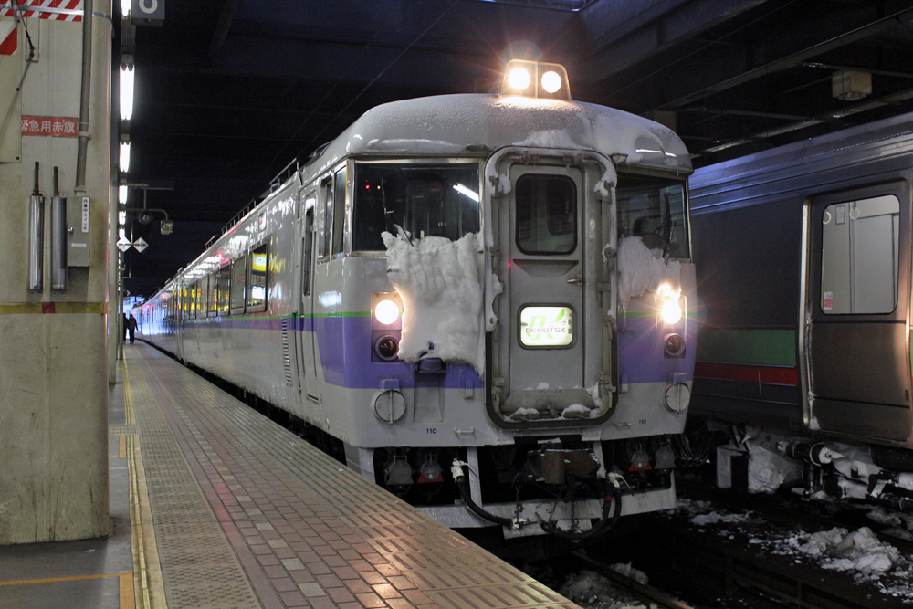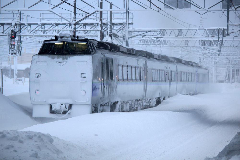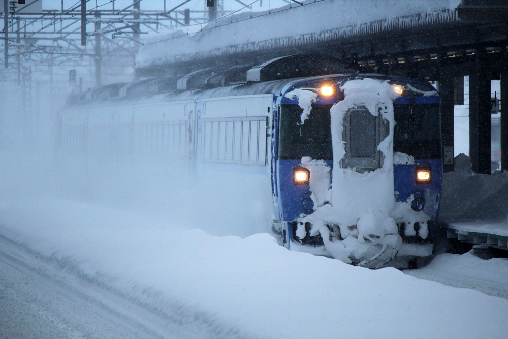 訪問時に記録的な豪雪だった岩見沢駅で撮影したオホーツクは、まだ札幌圏内しか走行していないにも関わらず前も後ろも雪まみれ。