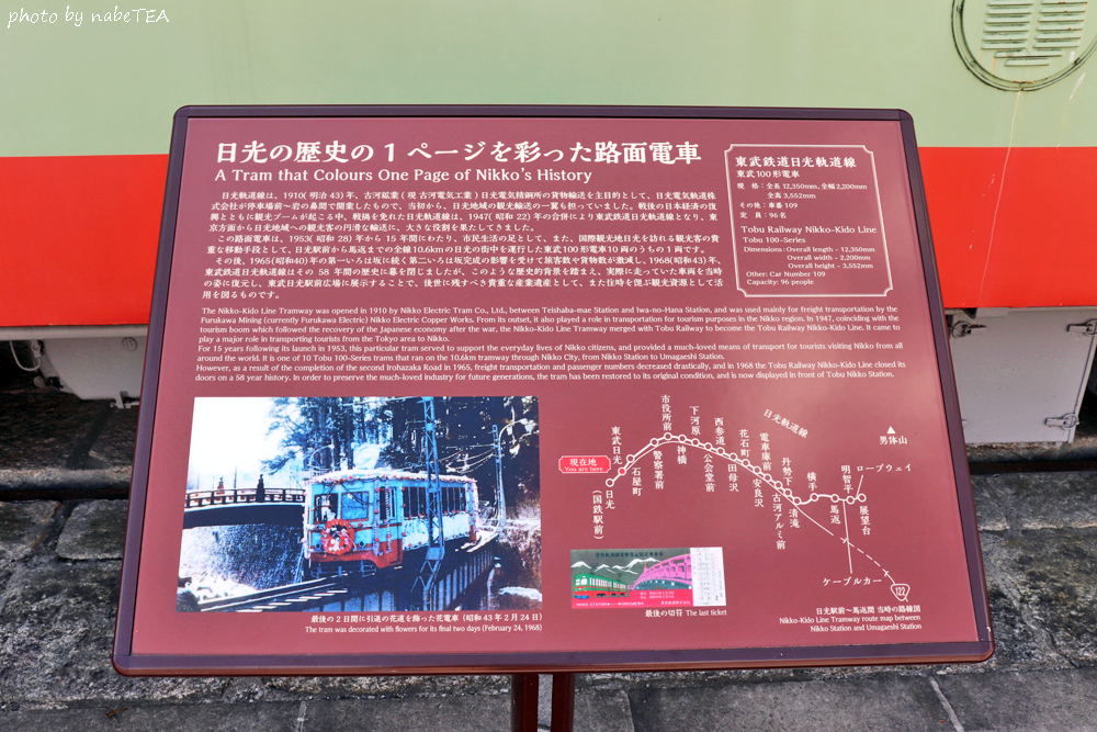 東武日光駅前に保存されている109号車は日光軌道廃止後に岡山電気軌道に譲渡され活躍していた車両で、2020年3月からこの地で保存・展示されています。