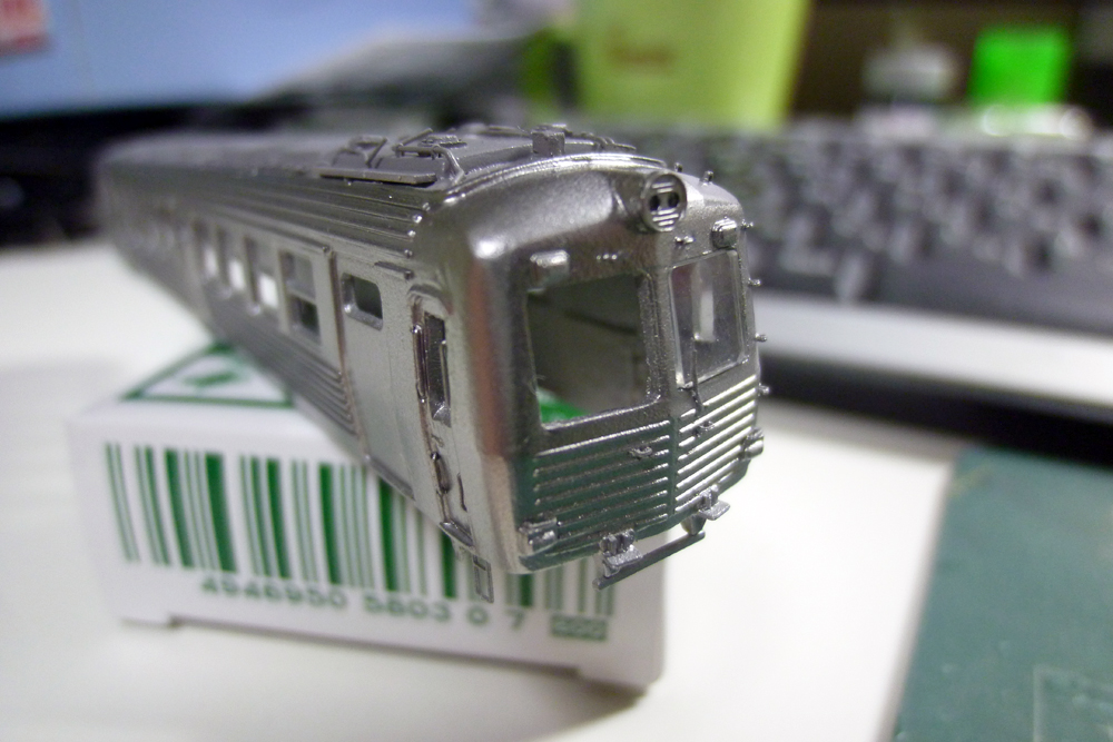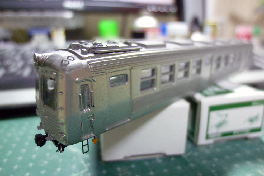 下地にホワイトを塗ってから屋根(GM9番)→艶消し→車体(スーパーステンレス)→おでこ滑り止塗装(GM9番)の順に塗っています。