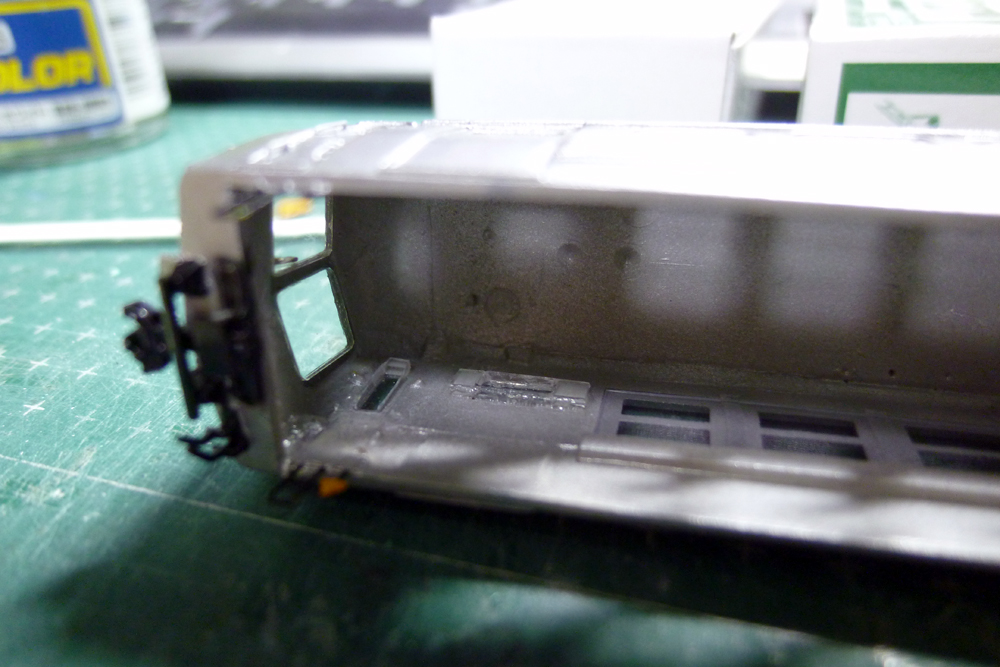 乗務員扉はそのまま乗務員扉用窓を使用。だいぶ削り込む必要がありましたが、やはり嵌めこみ化した方が見栄えはよくなりましたので。