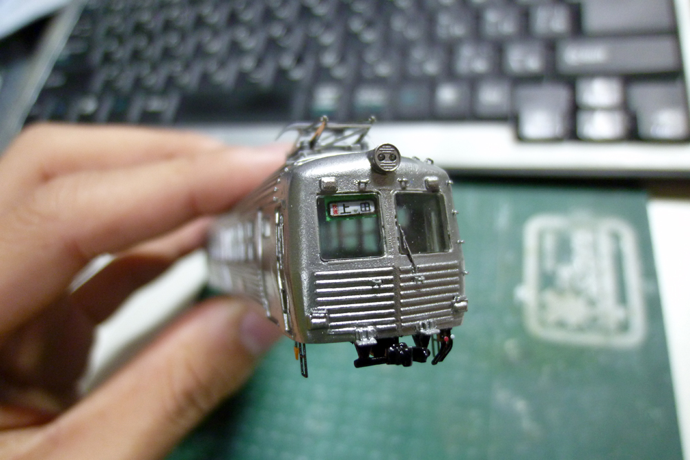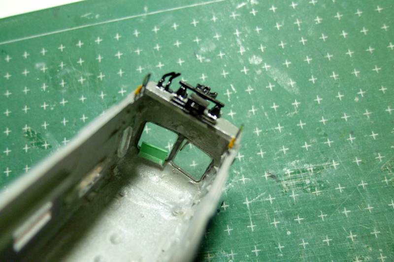 適当なプラ板を明るいグリーン(もっと淡い色の方がそれらしいのですが色が無く…)に塗り、その上にクロスポイントの7200系用行先表示機金属パーツを貼りつけています。