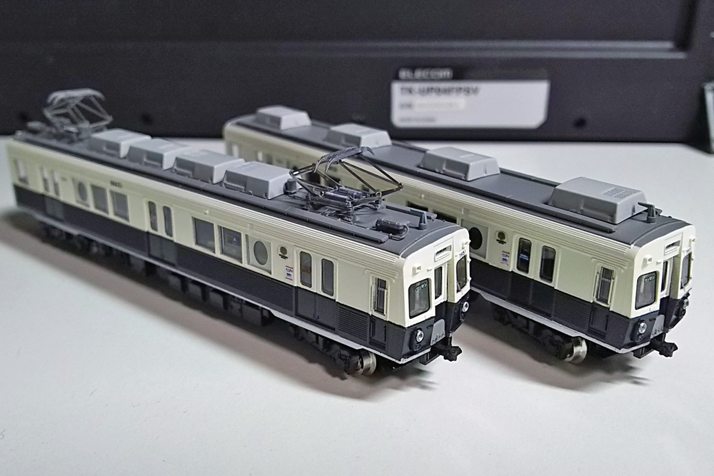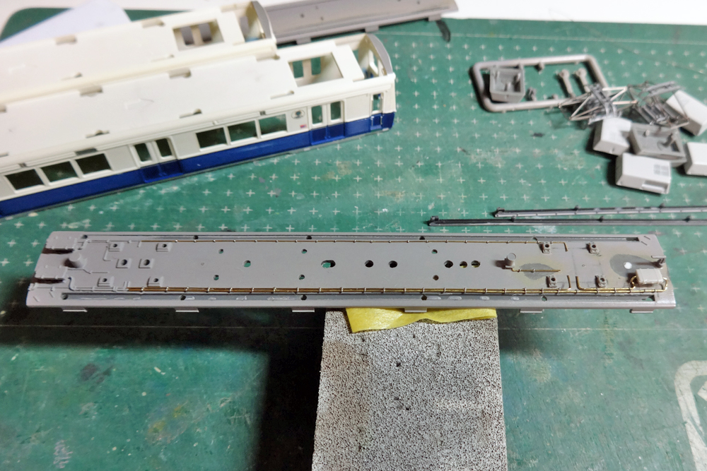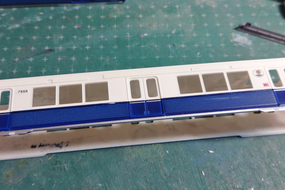 これらの改造の後、屋根はGM9番、車体はFinisher's「アイボリーホワイト」+自家調合の濃紺+裾部のシルバーで一気に塗装して完成です。