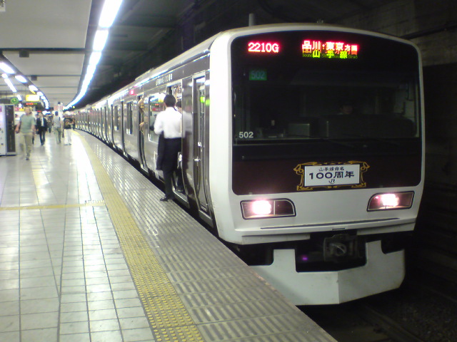 現在、山手線では命名100周年ということで昔の姿に模した電車を…とぶどう色2号のシートがE231-500に貼られて全身茶色になっています。