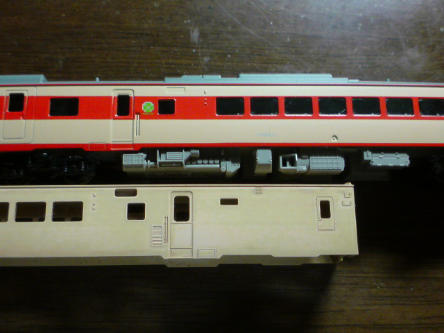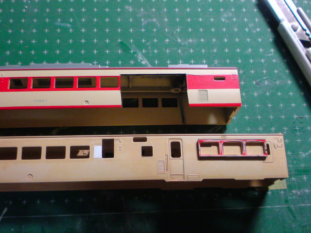 付け足した普通室の窓部分が黒いのは超旧製品の車体が黒いプラせ製作されているから。これであの国鉄色のクリームを明るく発色させていたんだから驚きです。