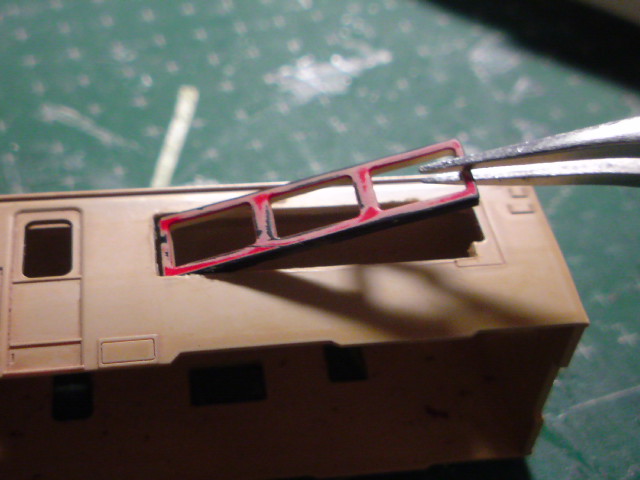 切り出した窓3連のサイズに合わせて車体側面に穴を開け、そこにはめこみます。