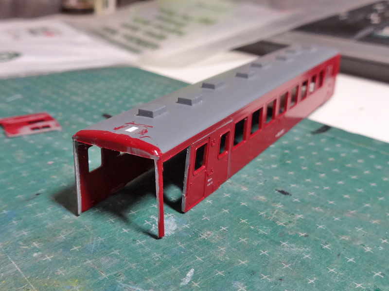 切り出した前面部分はオハ50の後退角に合わせて曲げています。