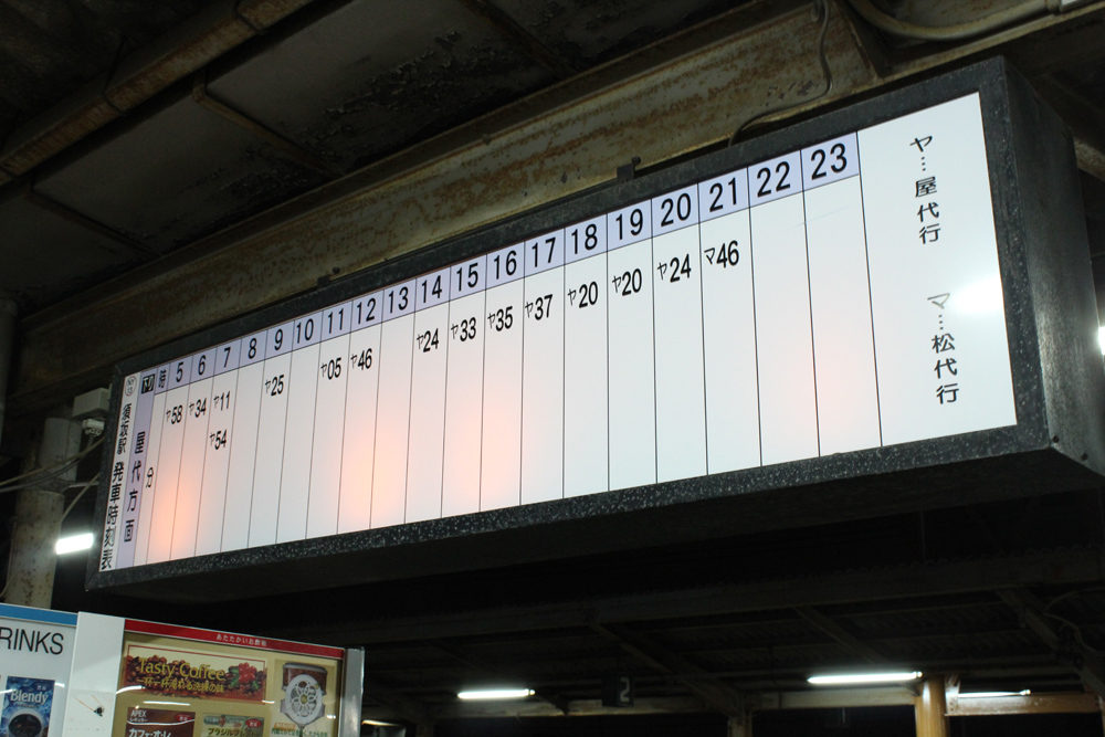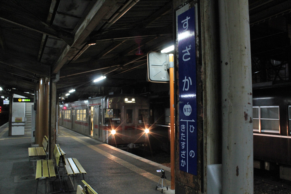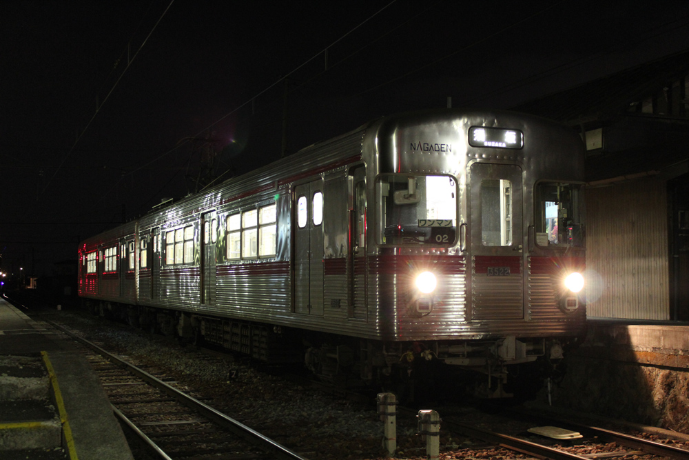 飯田から中央道へ乗ったものの長野市はまだまだ遠く、先行の2427さんを待たせて須坂駅へ20時過ぎに到着。運よく終電の1本前、20:24発屋代行きを撮影できました。