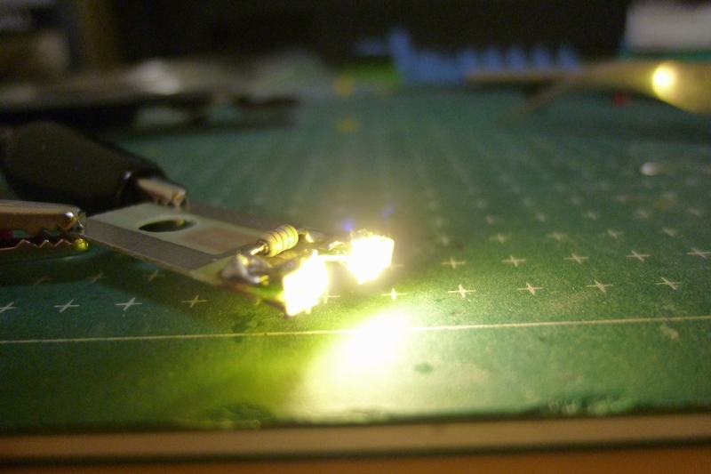 前照灯・尾灯それぞれ2つづつ付いていますので一度切り離してから今回購入してきたチップLEDを取り付けました。