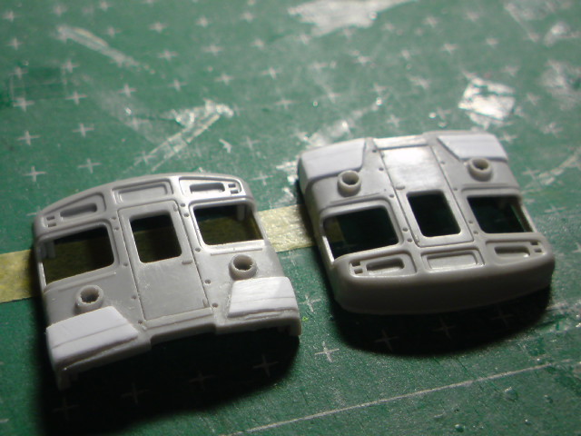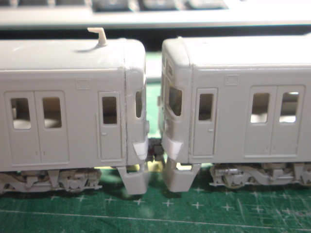本来西武2000系は前面にステンレスの飾り板がついていてるのですが、模型ではそれが凹みで再現されています。塗装はしやすいのでしょうが、実物とはかけはなれたイメージになってしまうのでまずはそれを修正します。