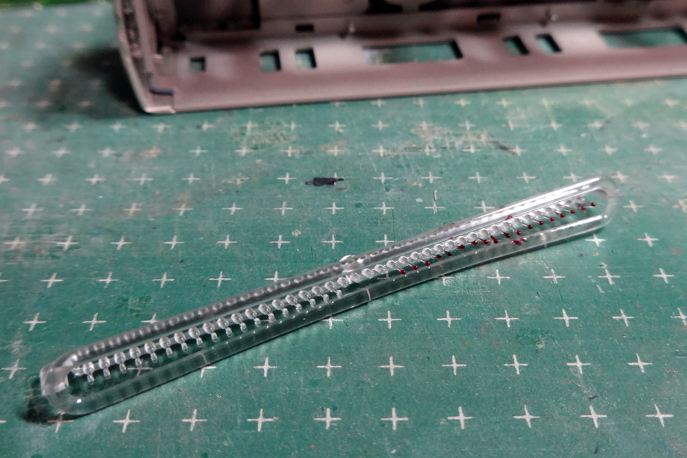 Nゲージだと塗り分けに手間が必要なため車側灯に色差しをすることもほとんど無く車体色のままが多いのですが、クリアパーツが嵌るとかなり印象が変わってきます。