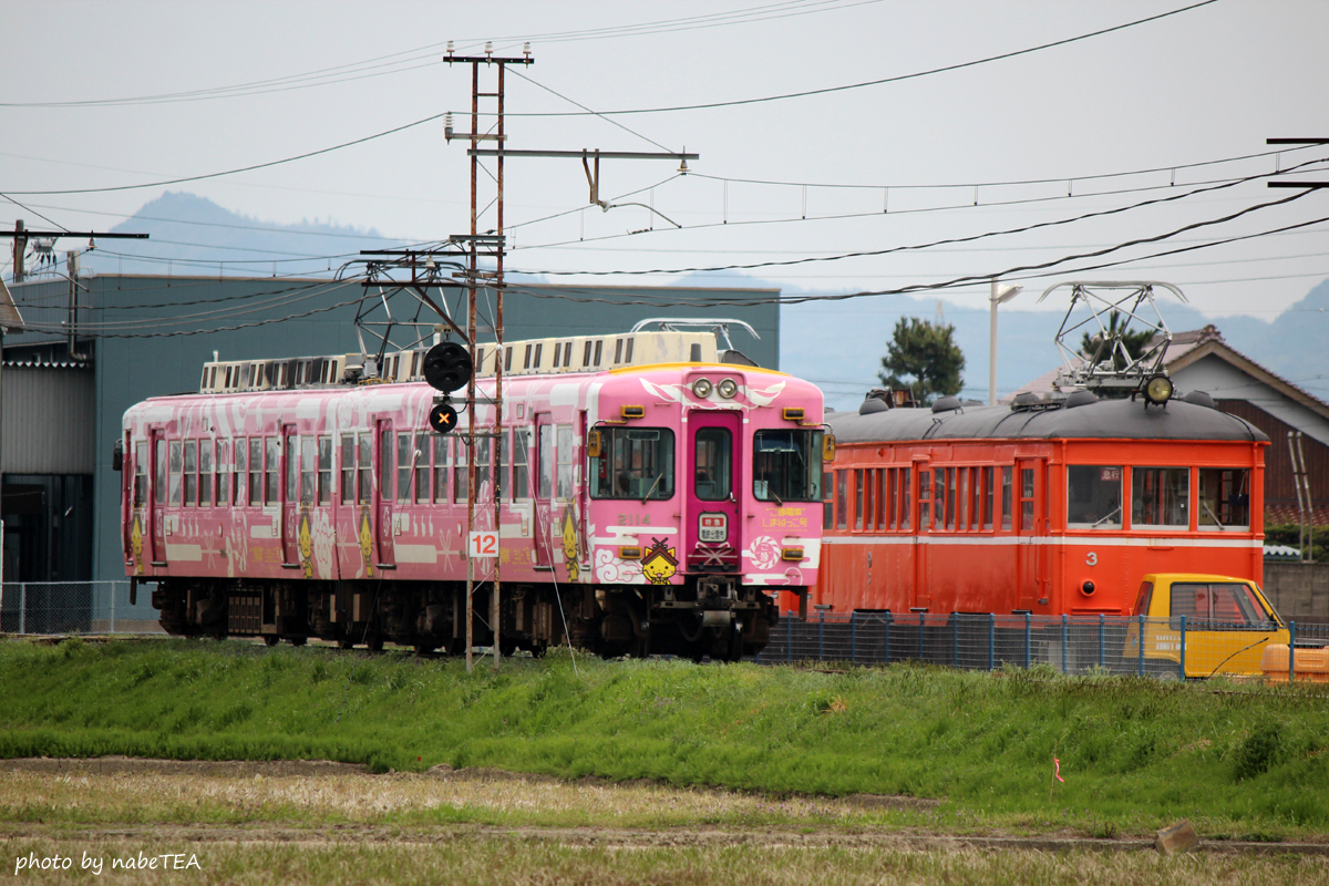 ▲保存車のデハ3と並んだ「しまねっこ号」@高浜~川跡