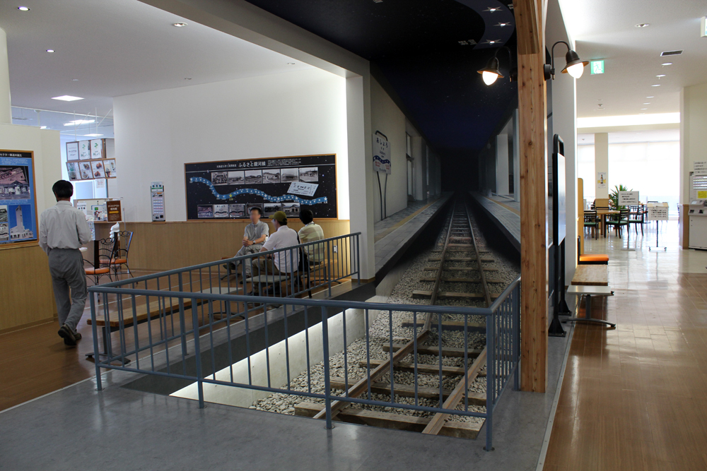 ただ、ここが駅であったことを伝えるためか単線分の線路が残され、両壁には線路につながるように写真が貼られていました。