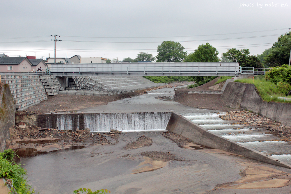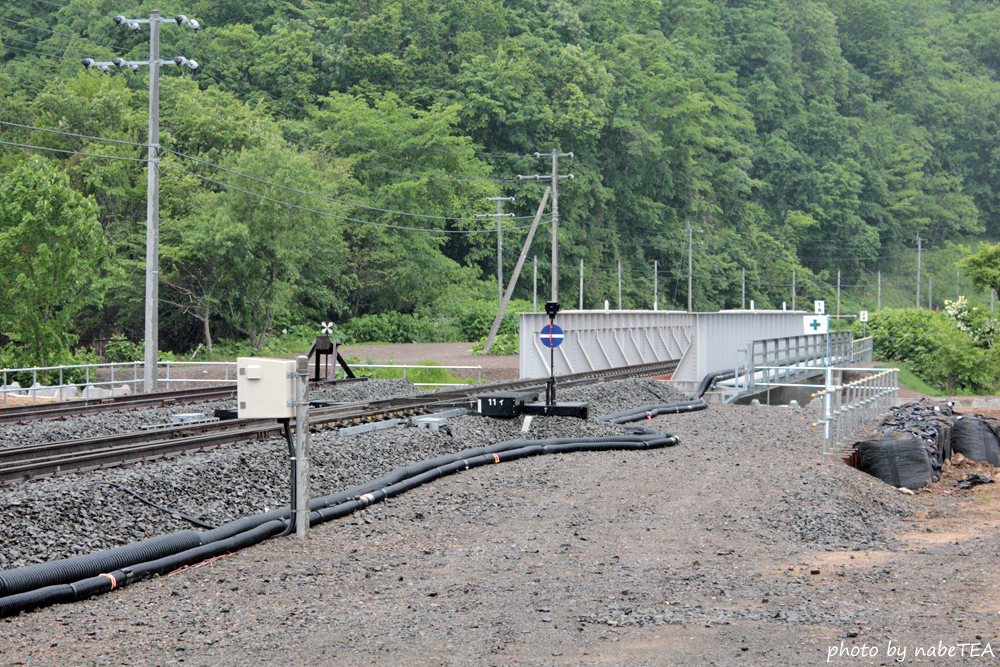 流出前は複線の鉄橋で写真左側の側線が千歳方へ続いていましたが、架け替えられた鉄橋は単線のもので、引上げ線は川の手前で打ち切られています。