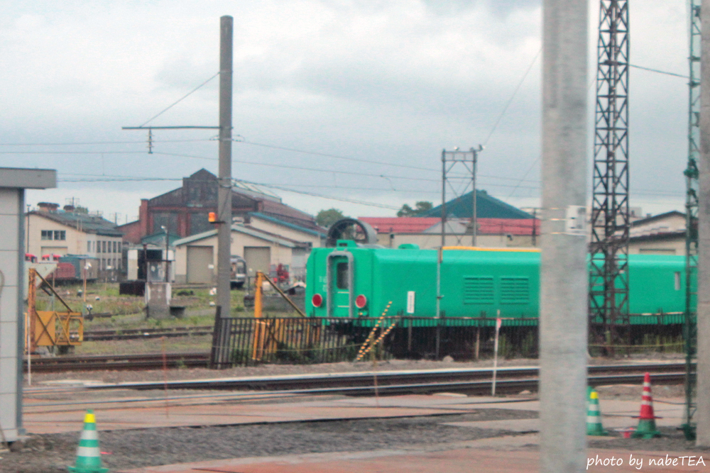 新千歳へ向かう途中、前日苗穂工場の奥に押し込まれていた新型検測車マヤ35が、千歳線の車内から見える位置まで引き出されていました。