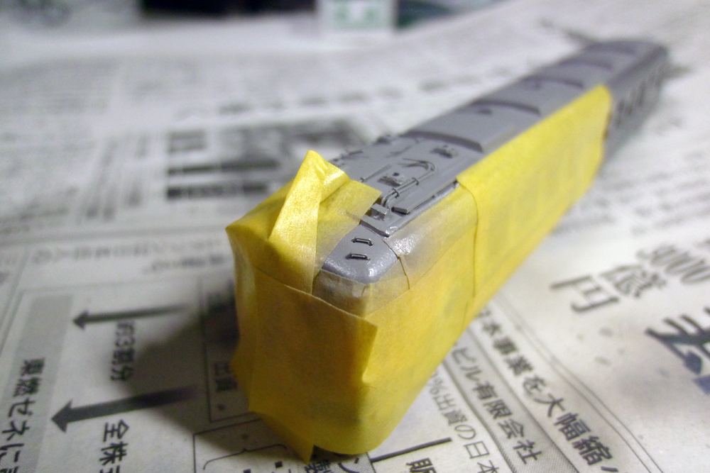 下地にホワイトを塗ってから屋根(GM9番)→艶消し→車体(スーパーステンレス)→おでこ滑り止塗装(GM9番)の順に塗っています。