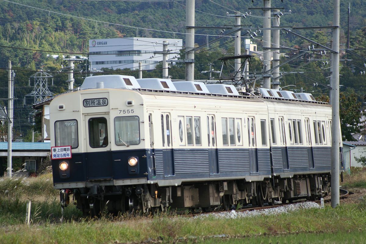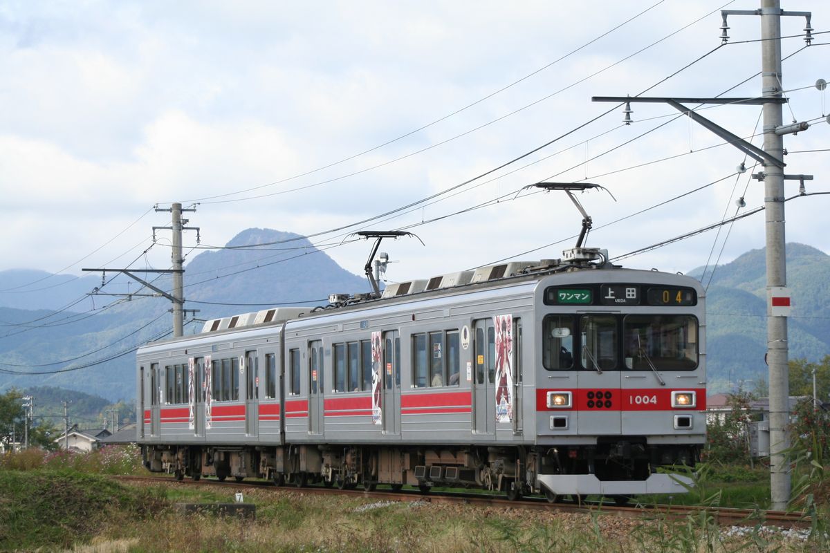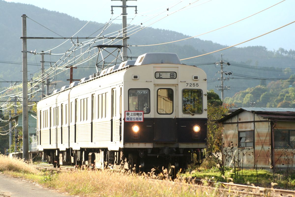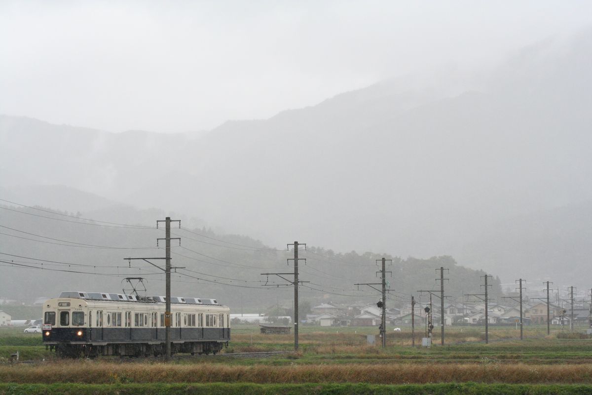 下之郷から来た別所温泉行き下り列車は、右に90度カーブして中塩田へと向かうのですが、このカーブが直線に変わる部分を望遠で狙っています。架線柱との位置関係など課題が残る写真になってしまいましたし、ちょっと通いたい撮影地になりました。