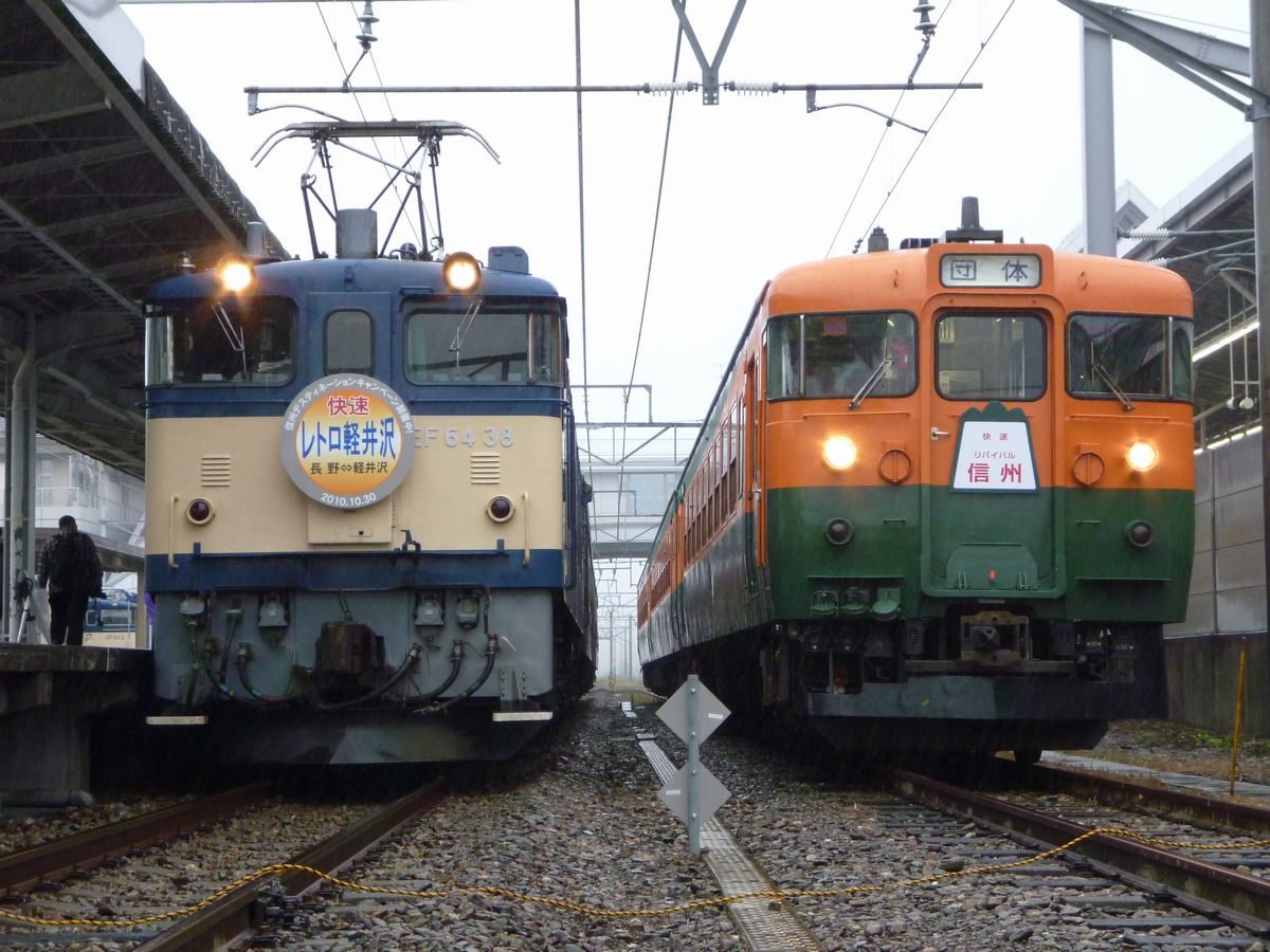 臨時列車のEF64-38+旧客の編成と湘南色の169系S52編成が並べられており、ホームでは部品やスタフ、サボの販売が、改札前(ラッチ内)では信州私鉄4社のグッズ販売が行われていました。