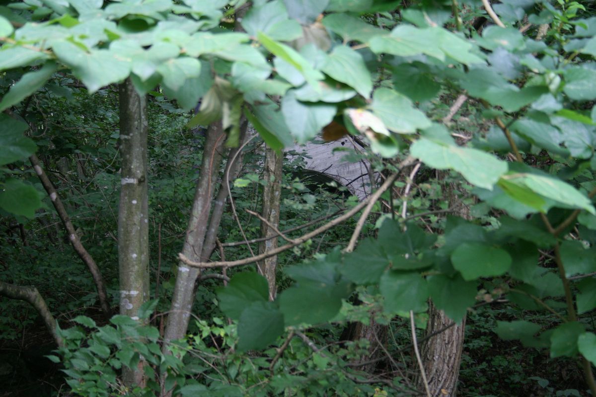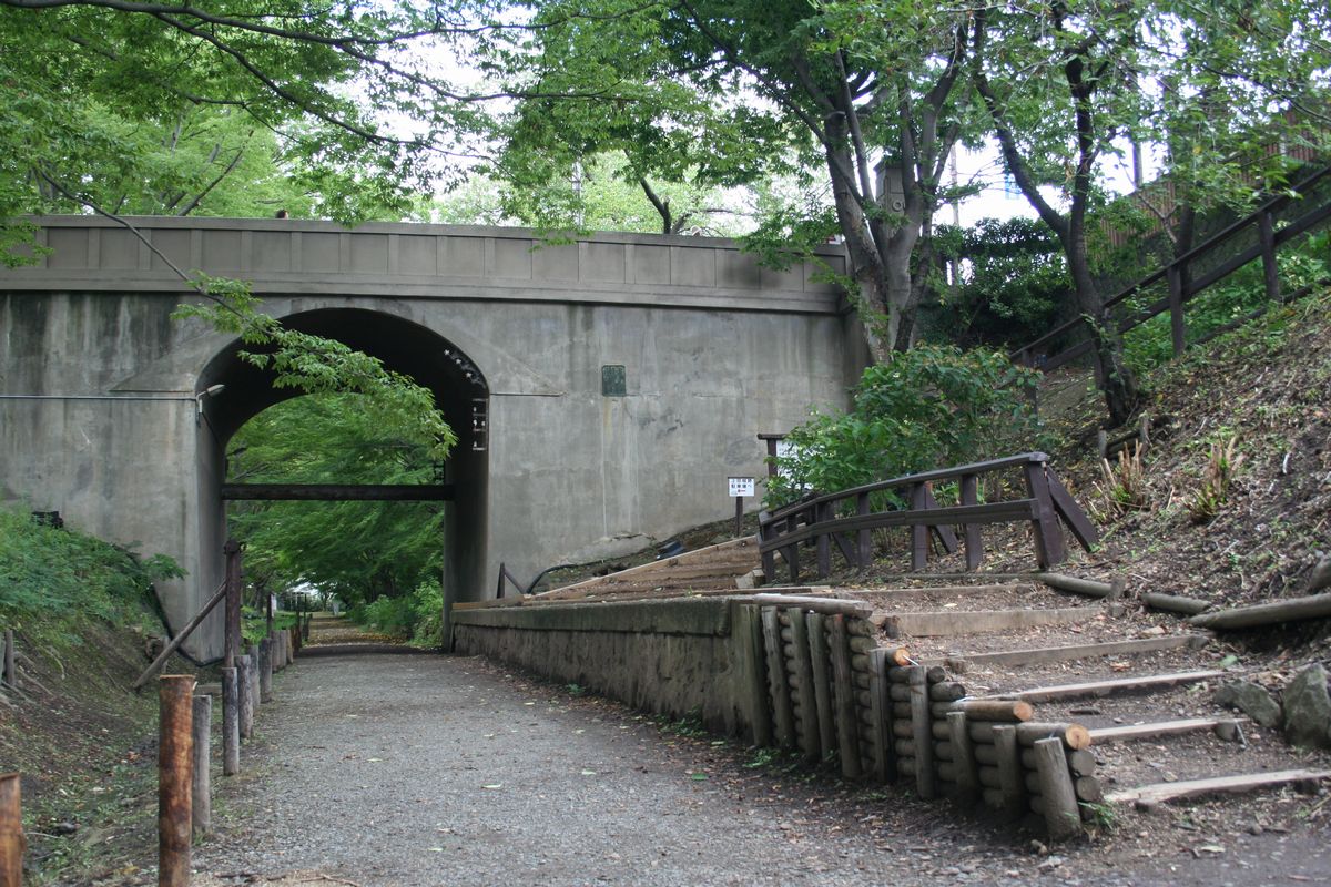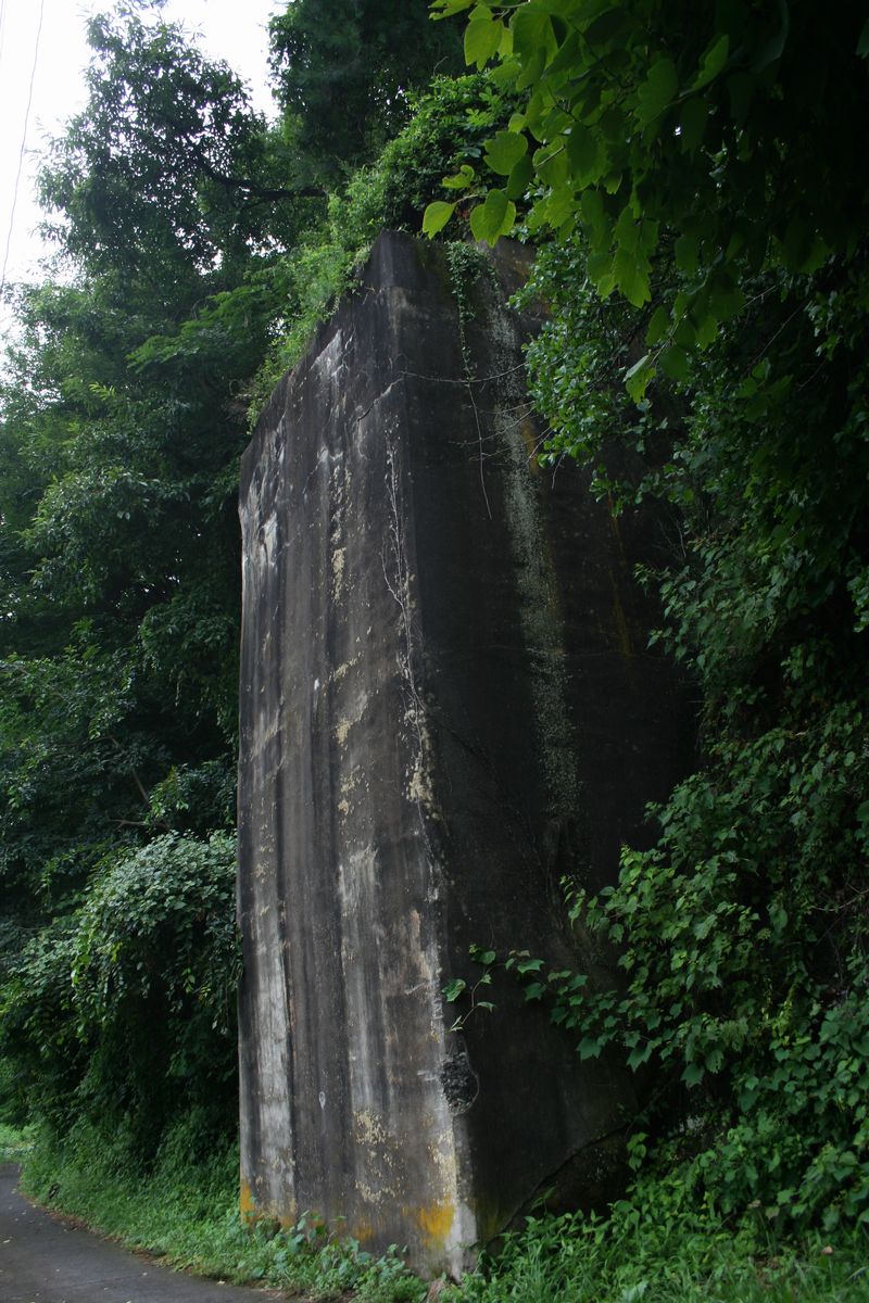 橋台の脇の斜面を目を凝らして見上げたのですが、やっぱりありました。神川橋梁に直結していた「伊勢山隧道」の真田方坑門です。写真をクリックして拡大してもらえらばもっとよく見えると思います。