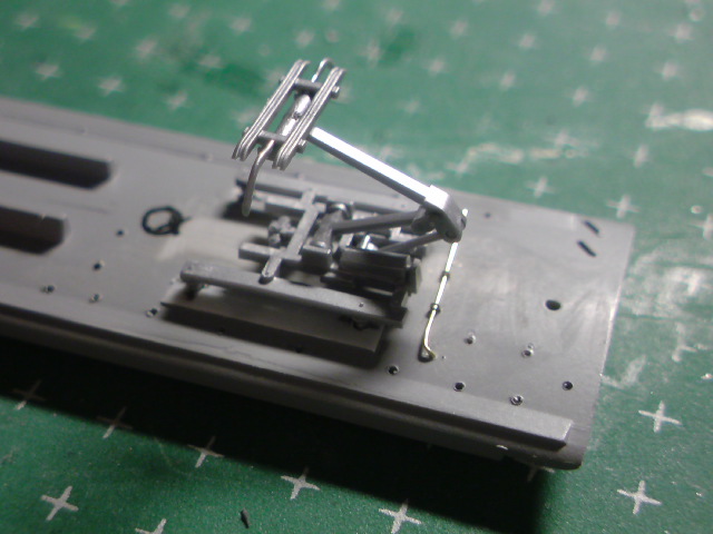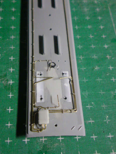 右下に飛び出た配管ですが、これはまだ妻板に固定していなからです。ここは妻板の色と同じ銀色で塗りたい(実車はライトグレーなのですが、元からモールドされている配管と合わせるため)ので、固定せずに先に塗装をしてしまいます。