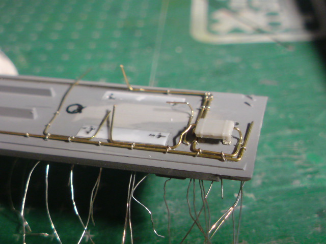この車両はパンタとヒューズボックスの間の配線がかなりわけのわからないことになっており、写真や以前製作した1001Fを確認しつつ固定していきます。固定する順番を間違えると配管の上下関係が逆になってしまいますし、「2本一緒に固定する」場所では複数の配管を一気に処理しなくてはならないのでかなりストレスの溜まる作業になります(苦笑